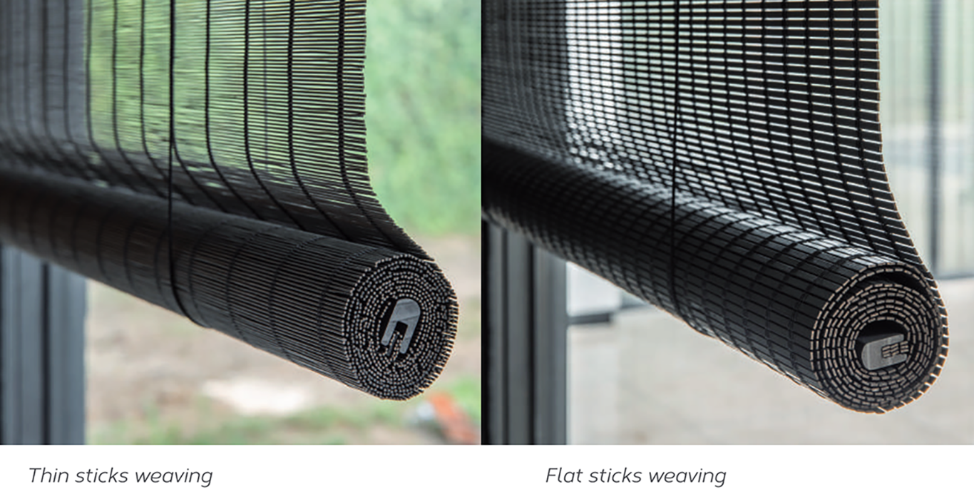 Het geweven hout is leverbaar in twee soorten wevingen: 'thin sticks' en 'flat sticks'. Bij ‘thin sticks’ is de doorkijk transparant en bij ‘flat sticks’ in-between. Dat laatste betekent dat je er wel gewoon doorheen kunt kijken, maar het materiaal zelf iets dikker is. Hierdoor kun je nog steeds makkelijk naar buiten kijken, maar voorbijgangers niet meer zo eenvoudig naar binnen.